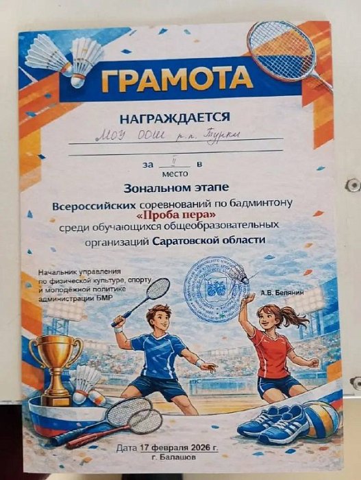 17 февраля на базе ФОК «Газовик» г. Балашова состоялся зональный этап Всероссийских соревнований по бадминтону «Проба пера» среди общеобразовательных организаций Саратовской области. Команда МОУ ООШ р. п. Турки победитель муниципального этапа приняла участие в соревнованиях и заняла заслуженное II место.
