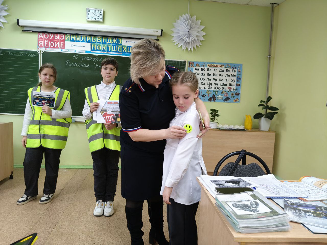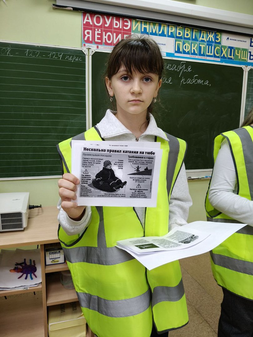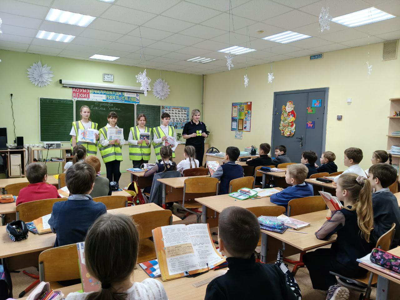 Инспектор по пропаганде объяснила ребятам, что ни один, даже самый опытный водитель, не сможет оставить автомобиль мгновенно, тем более на заснеженной или заледенелой дороге, поэтому необходимо быть заметными на дороге.